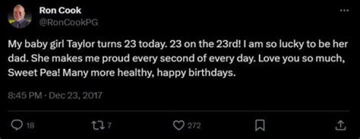 In a social media post wishing Taylor a happy 23rd birthday on December 23, 2017, Ron Cook indicated his daughter was born in 1995.
