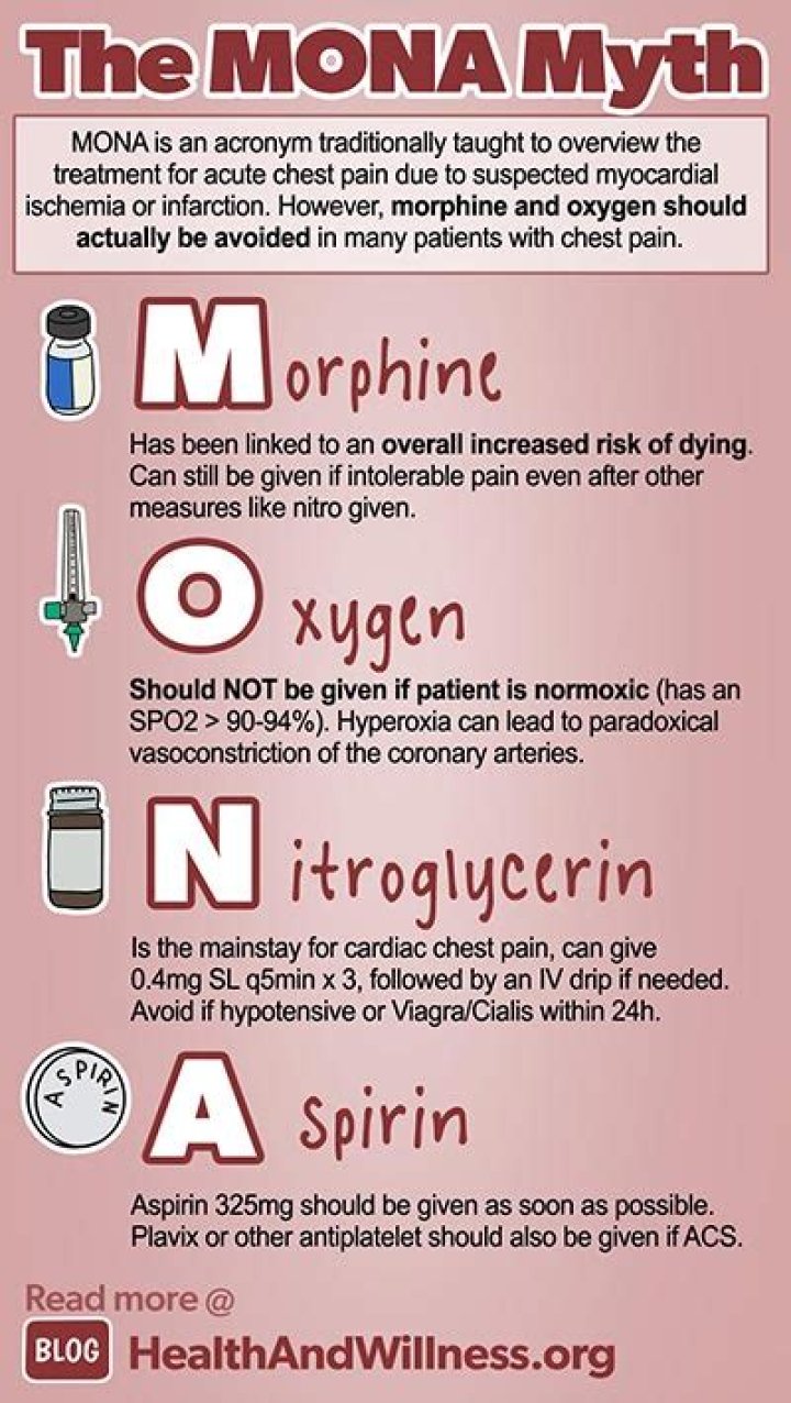 Morphine, oxygen, nitrates, and aspirin — collectively known as MONA — are no longer the preferred door prizes for chest pain patients entering the emergency cardiac care system. Of course, morphine and oxygen still have a limited role in acute coronary syndromes.Click to see full answer. Besides, what is Mona for chest pain?To the Editor: The mnemonic, MONA, which stands for morphine, oxygen, nitroglycerin, and aspirin, is used to recall the initial man- agement of patients with chest pain (ie, suspected acute cor- onary syndrome). However, in the era of evidenced-based medicine, a review of this mnemonic is needed (Fig. 1).Subsequently, question is, do you give aspirin or nitroglycerin first? Chew and swallow an aspirin, unless you are allergic to aspirin or have been told by your doctor never to take aspirin. Take nitroglycerin, if prescribed. If you think you’re having a heart attack and your doctor has previously prescribed nitroglycerin for you, take it as directed. Similarly one may ask, do you give oxygen for chest pain? Supplemental oxygen (O2) therapy in patients with chest pain has been a cornerstone in the treatment of suspected myocardial infarction (MI). More studies are needed in discussing hemodynamically unstable STEMI patients, as well as patients with non-STEMI, unstable angina and other emergency conditions.Can acute coronary syndrome be cured?Aspirin helps to prevent platelets from forming clots and helps to reduce the risk of a second heart attack by around 22 percent. With lifestyle changes and the right medication, it is possible to prevent acute coronary syndrome or to treat it and lead a normal life.