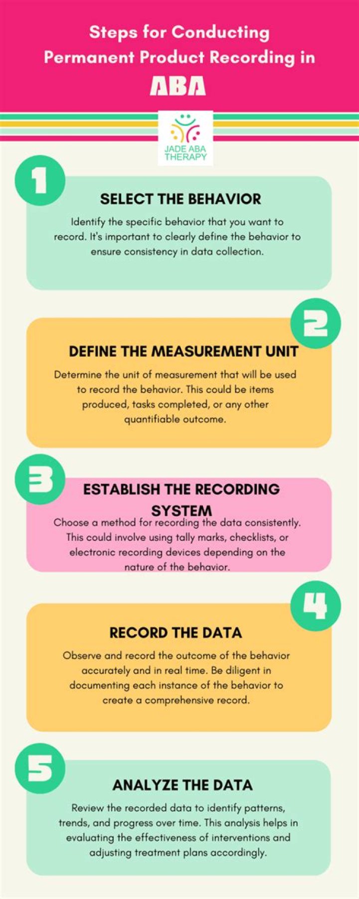 Grading Percent correct Rubrics Permanent Product: Recording tangible items or environmental effects that result from a behavior. It measures behavior after it has occurred.Click to see full answer. Regarding this, what is permanent product in ABA? PERMANENT PRODUCT RECORDING : A behavioral recording method in which durable products of a behavior-such as the number of windows broken, widgets produced, homework problems handed in, rejects, percentage of test questions correct, and so on-are assessed. Not suited to measuring transitory behaviors.Likewise, which of the following is an example of permanent product recording? The number of assignments ripped or crumpled, number of pencils thrown, the number of items broken, or even photographs of self injury that occurs are examples of permanent products. Permanent product recording can reflect different types of behaviors in a variety of ways. Also asked, which could be measured by Permanent Product recording? Permanent products refer to the real or concrete objects or outcomes that result from a behavior. Common examples of permanent product measurements are the number of completed items, creative projects, quizzes, homework assignments turned in by student.What is an example of duration recording?Duration recording is used to document the amount of time a student spends engaging in a behavior. Examples of behaviors that may be observed using duration recording include crying, reading a book, writing in class, time spent working on a math assignment, or out of seat behavior.
